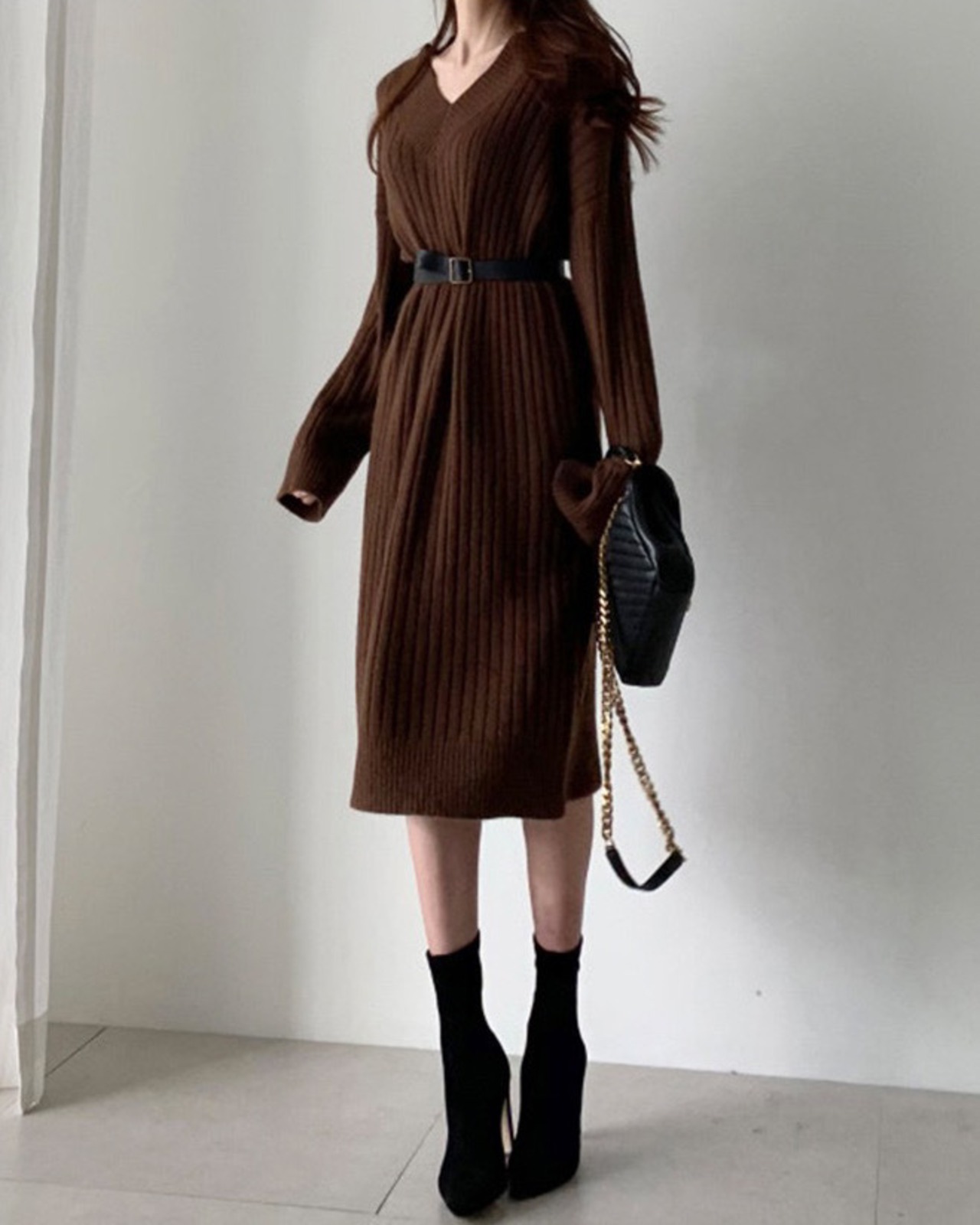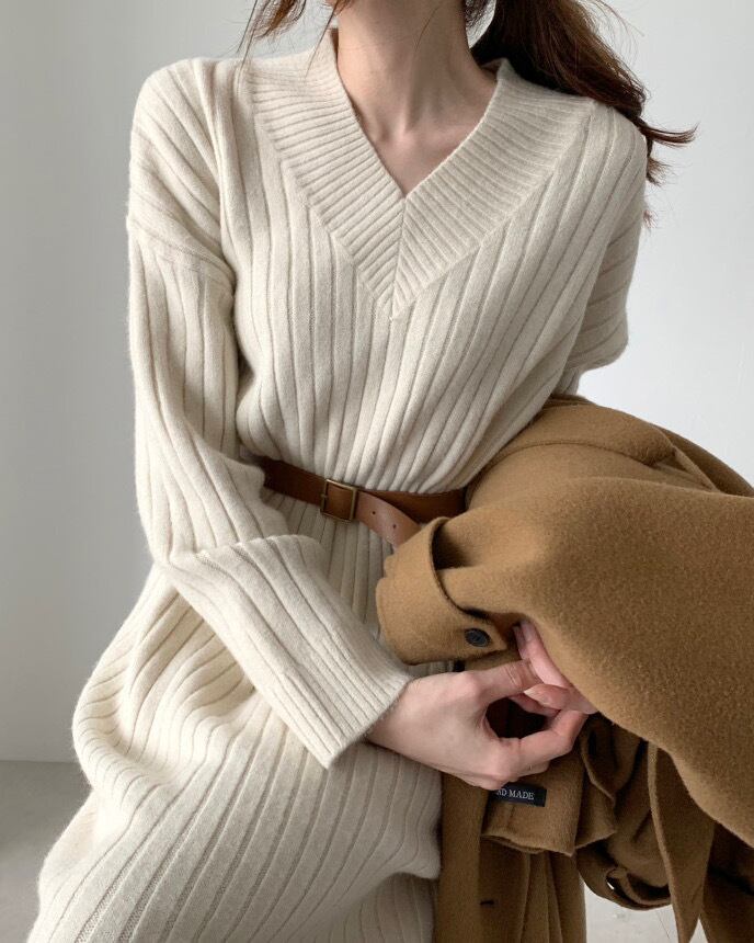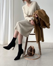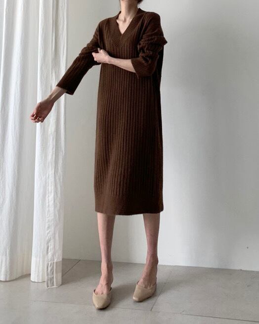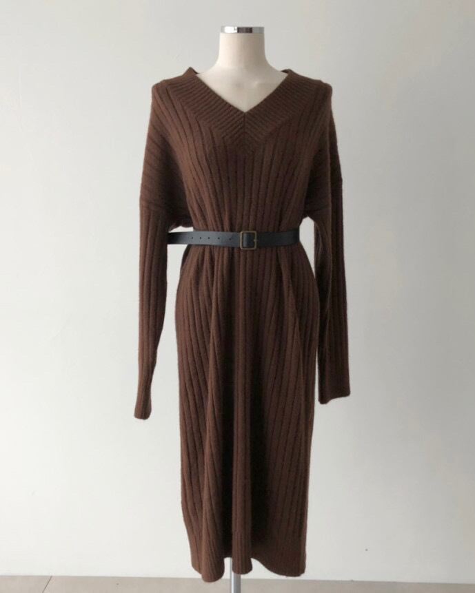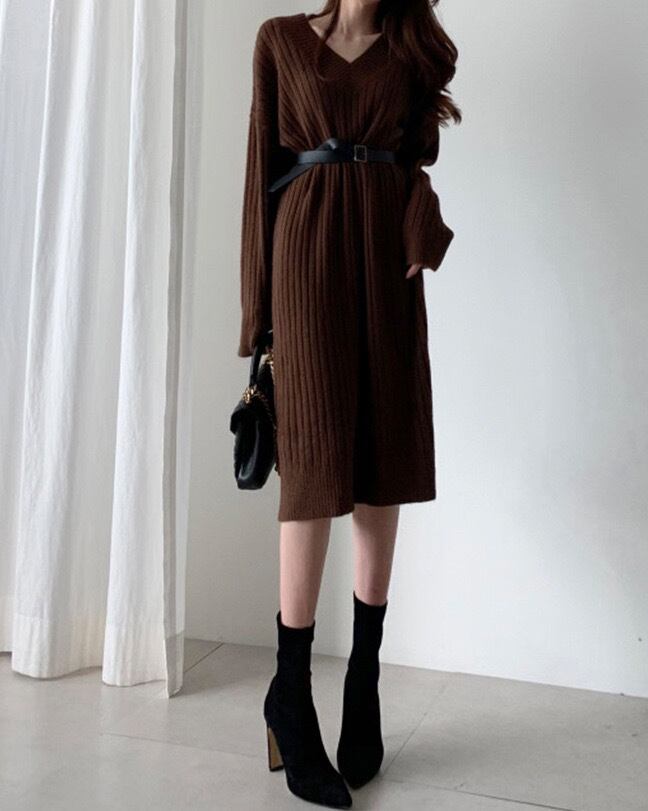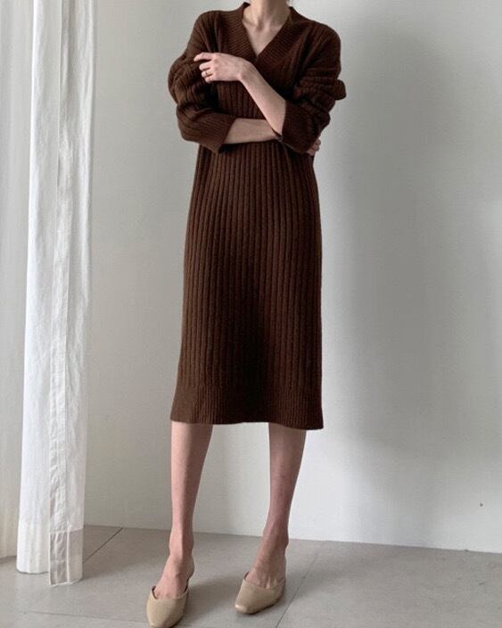 大人っぽいVネックがリュクスな印象のニットワンピース。