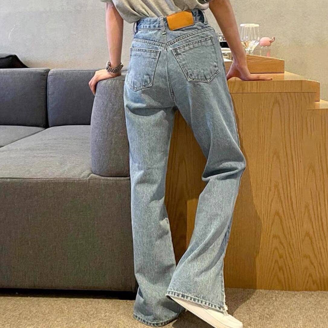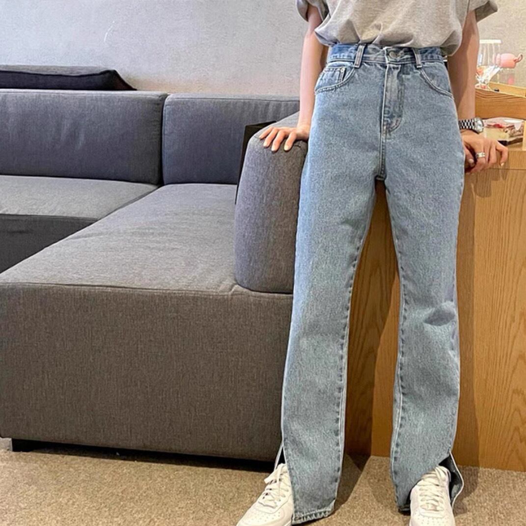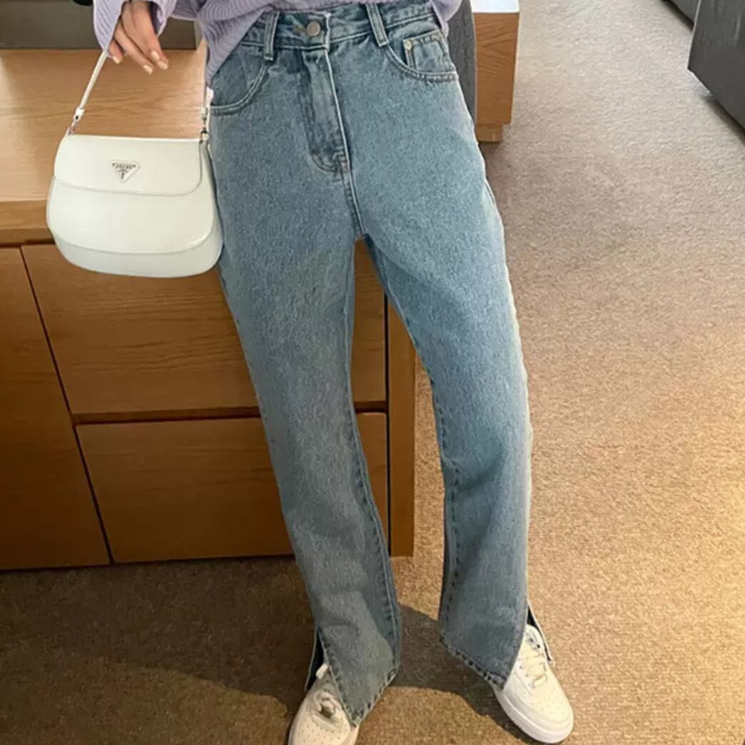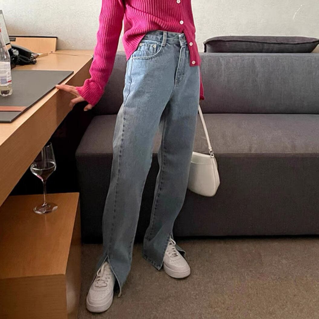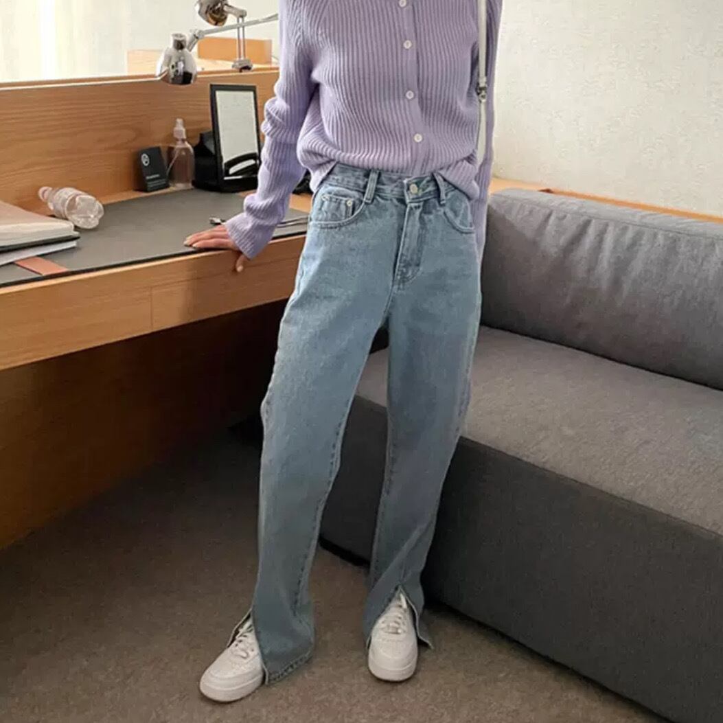 定番アイテムのストレートデニムにフロントスリットを施し、今年らしいエッセンスをプラス。