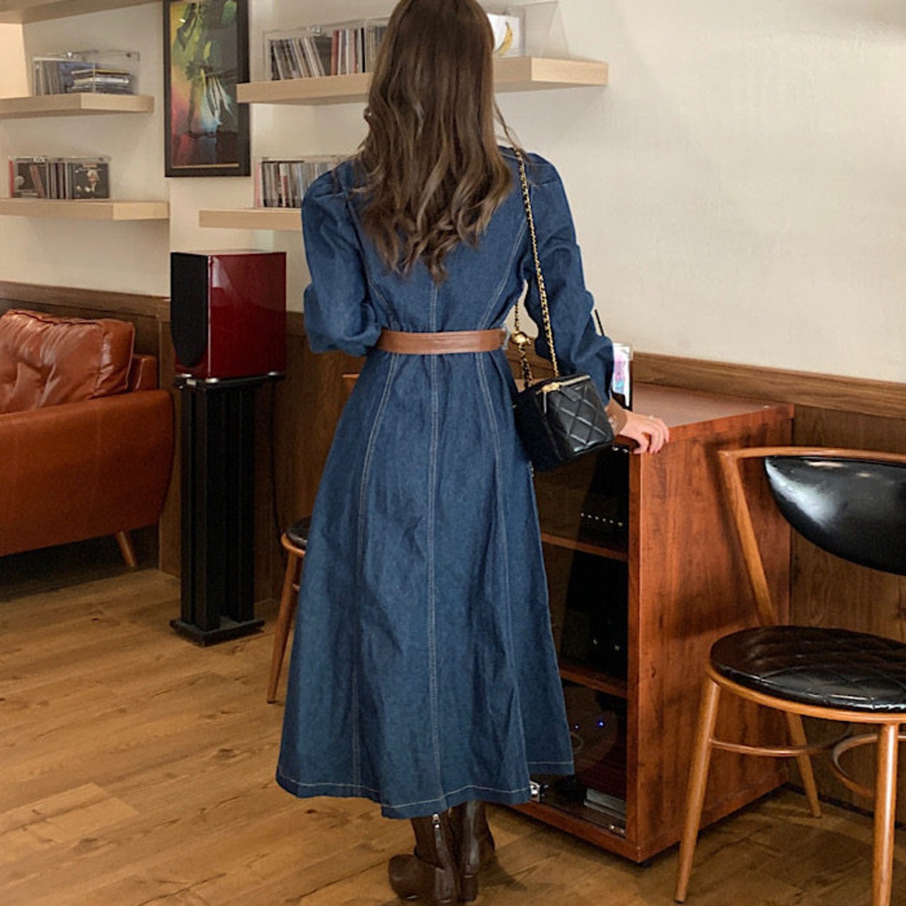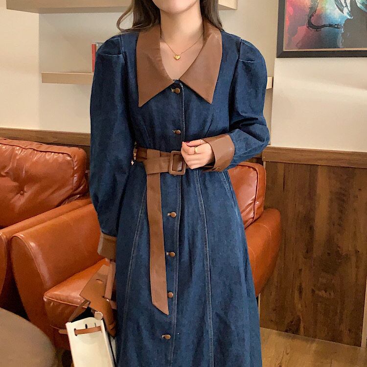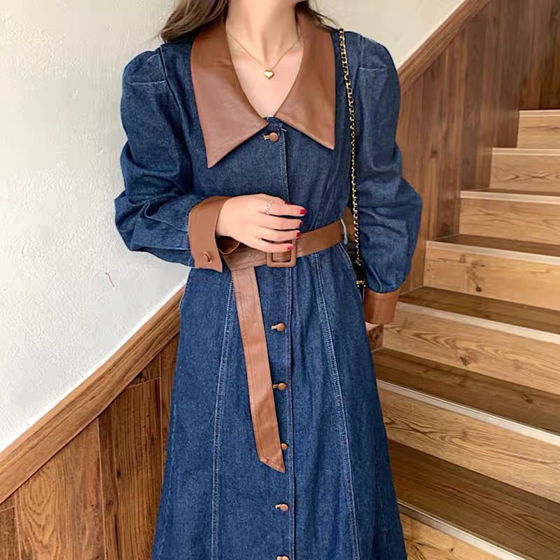 衿と袖口、ベルトにあしらったレザーがアクセントになっています。