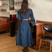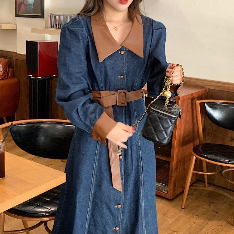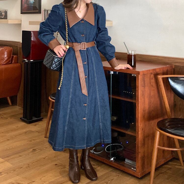 レザーの素材がドッキングして、カジュアルダウンして着れるので甘くなりすぎないデニムワンピースです。
