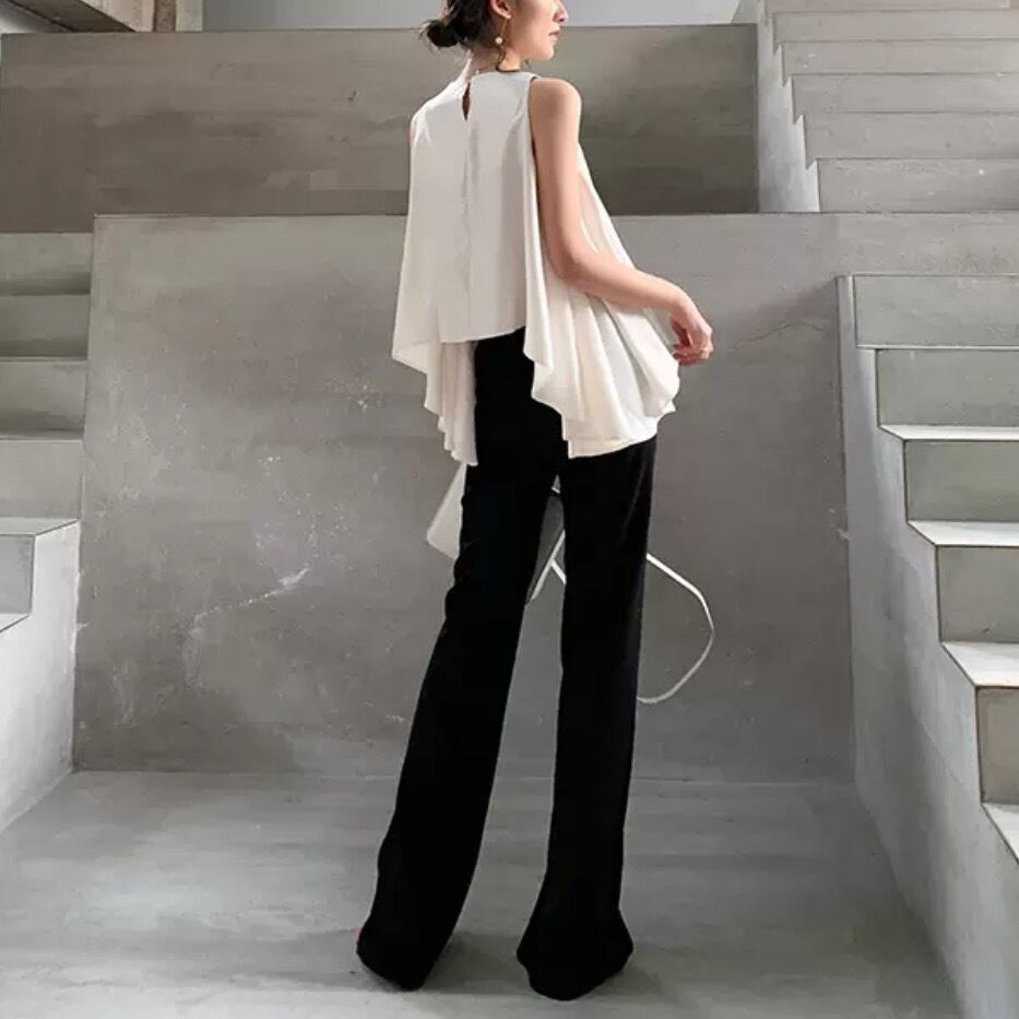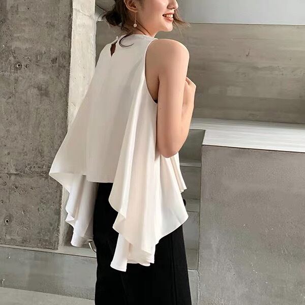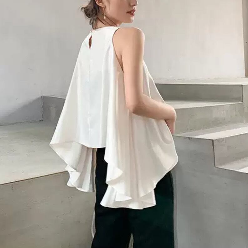 アシンメトリーのフリルが印象的なデザインノースリーブ。