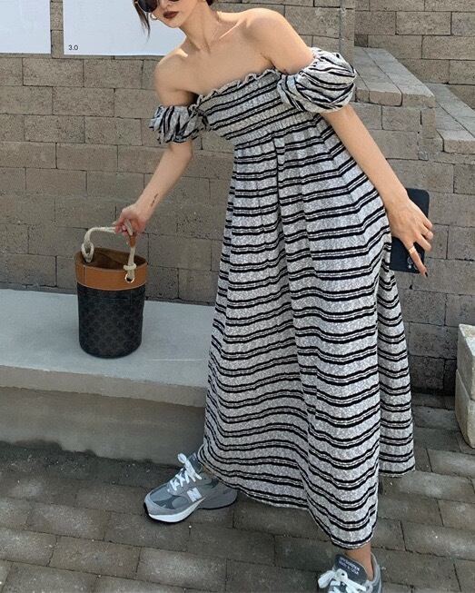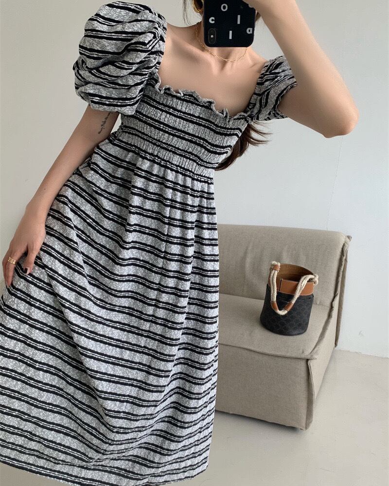 パフスリーブがトレンド感あふれるシャーリングワンピース 。