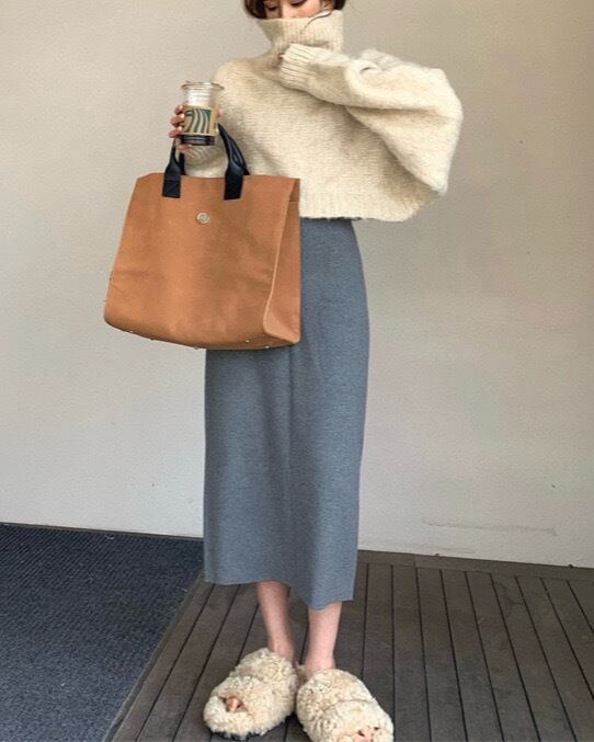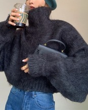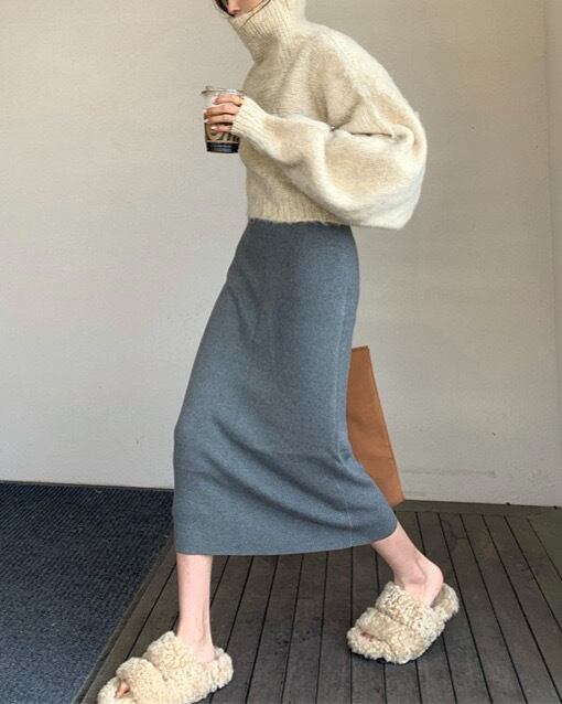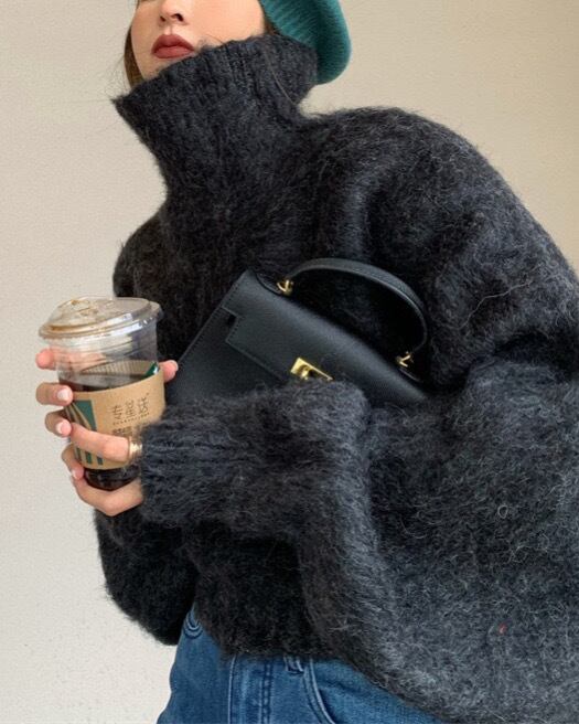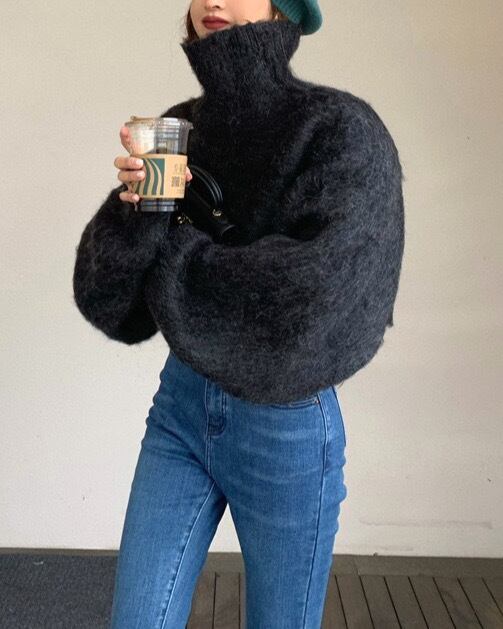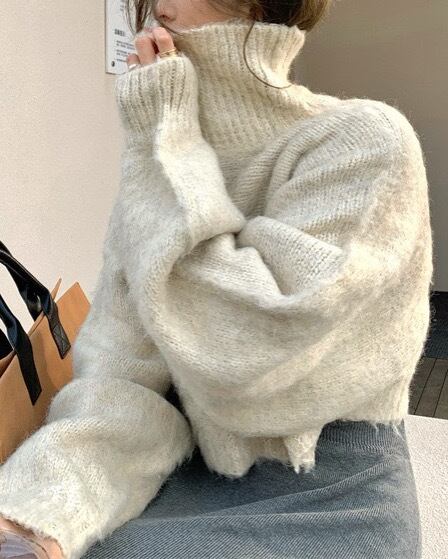 ハイネックで首回りを細くスッキリと見せてくれます。