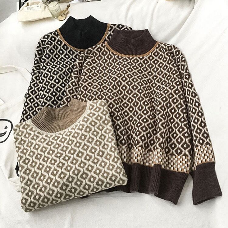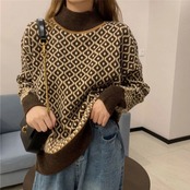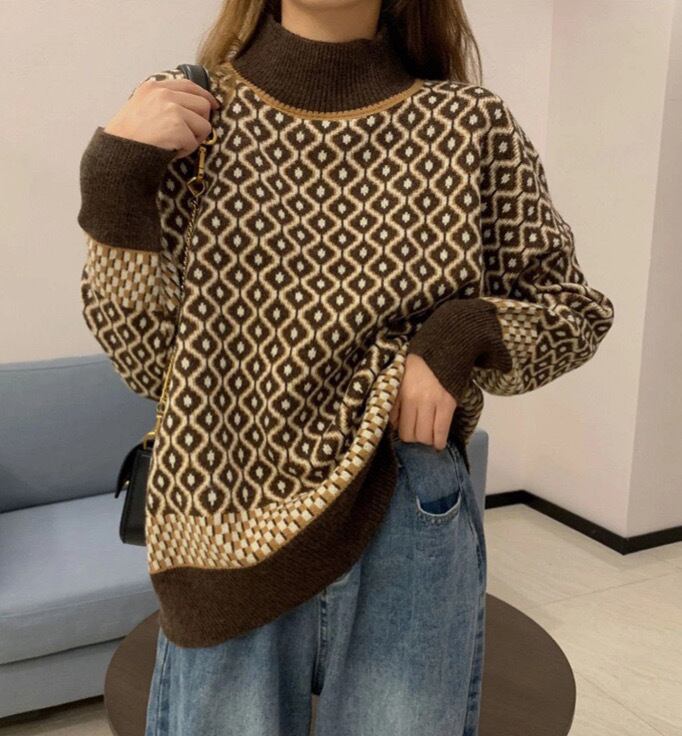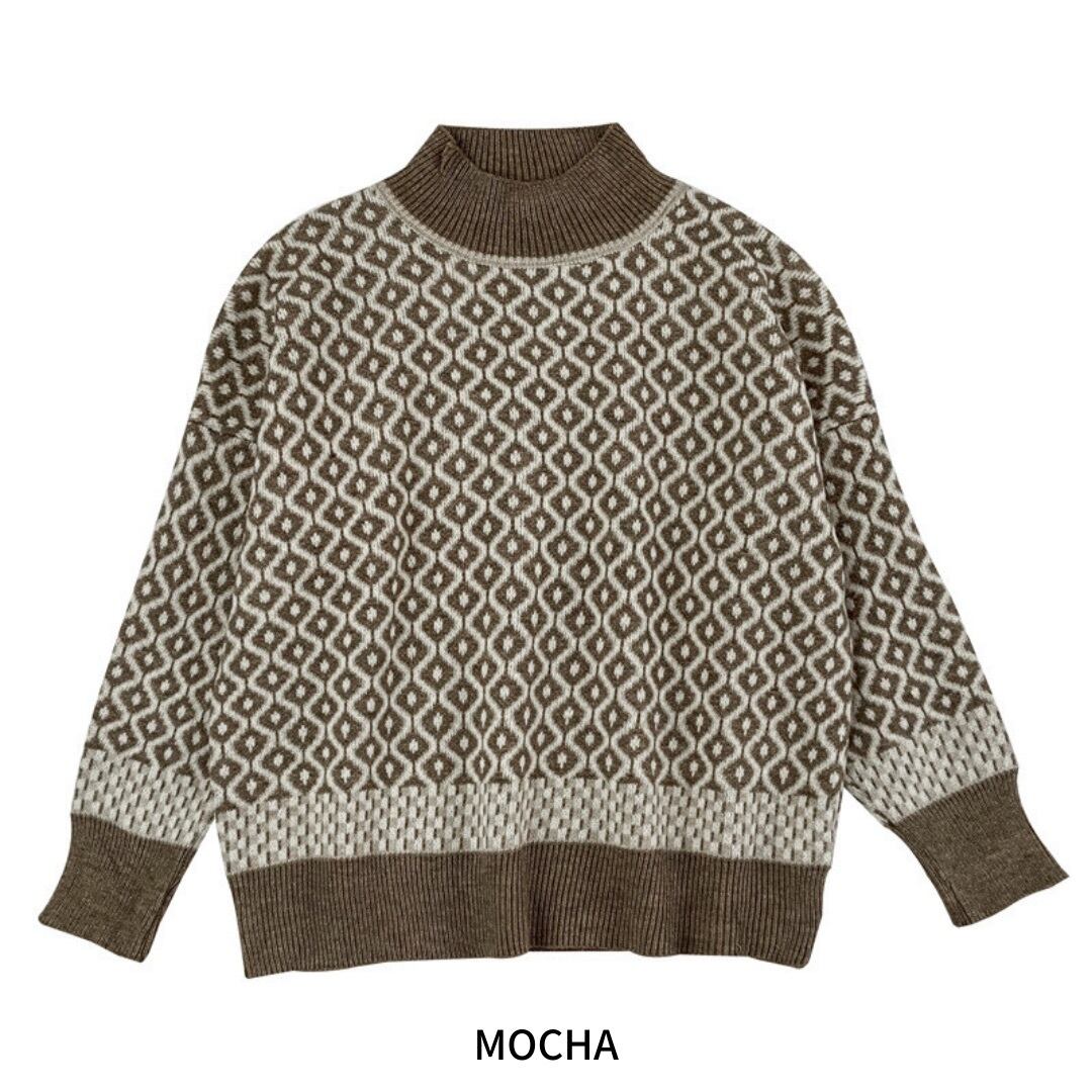 女性らしい大人なこなれ感を演出してくれるダイス柄切り替えハイネックニットトップス。
